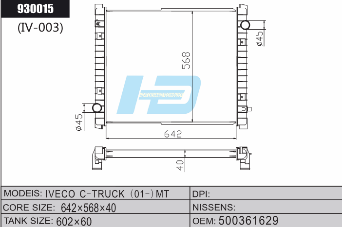 Custom Truck Radiator 930015 IVECO C-TRUCK(01-)MT 500361629